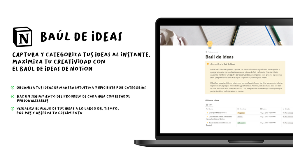 Con esta plantilla de Notion, nunca más volverás a perder una gran idea. Podrás organizar tus pensamientos de manera efectiva, y llevar un seguimiento de tus proyectos de forma más eficiente. La plantilla es totalmente personalizable, por lo que puedes adaptarla a tus necesidades y utilizarla de la forma que mejor se adapte a ti.